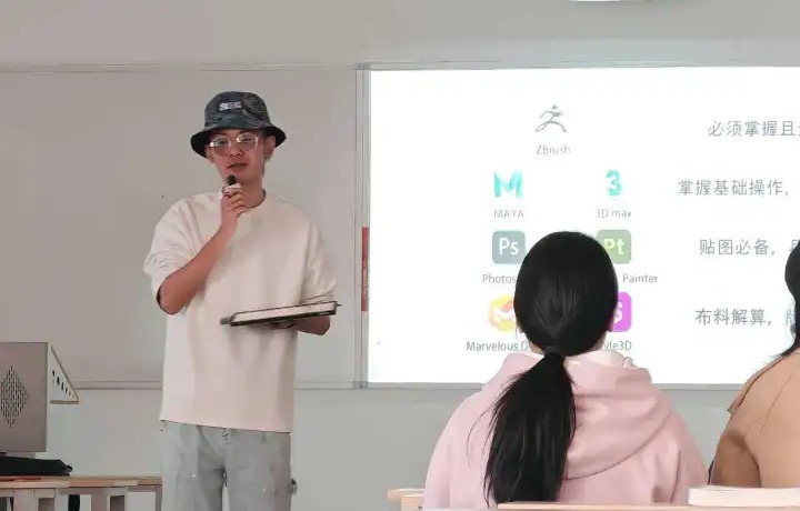 在必备技能环节,王涛列出行业“工具矩阵”:Maya、3DMax为基础建模必会软件,Photoshop、Painter为贴图制作标配,ZBrush、Substance实现高模雕刻与材质渲染,MarvelousDesigner、Style3D则用于布料解算与动态表现。他现场演示如何根据岗位JD匹配技能优先级,并针对学生现有作品给出优化方向。
