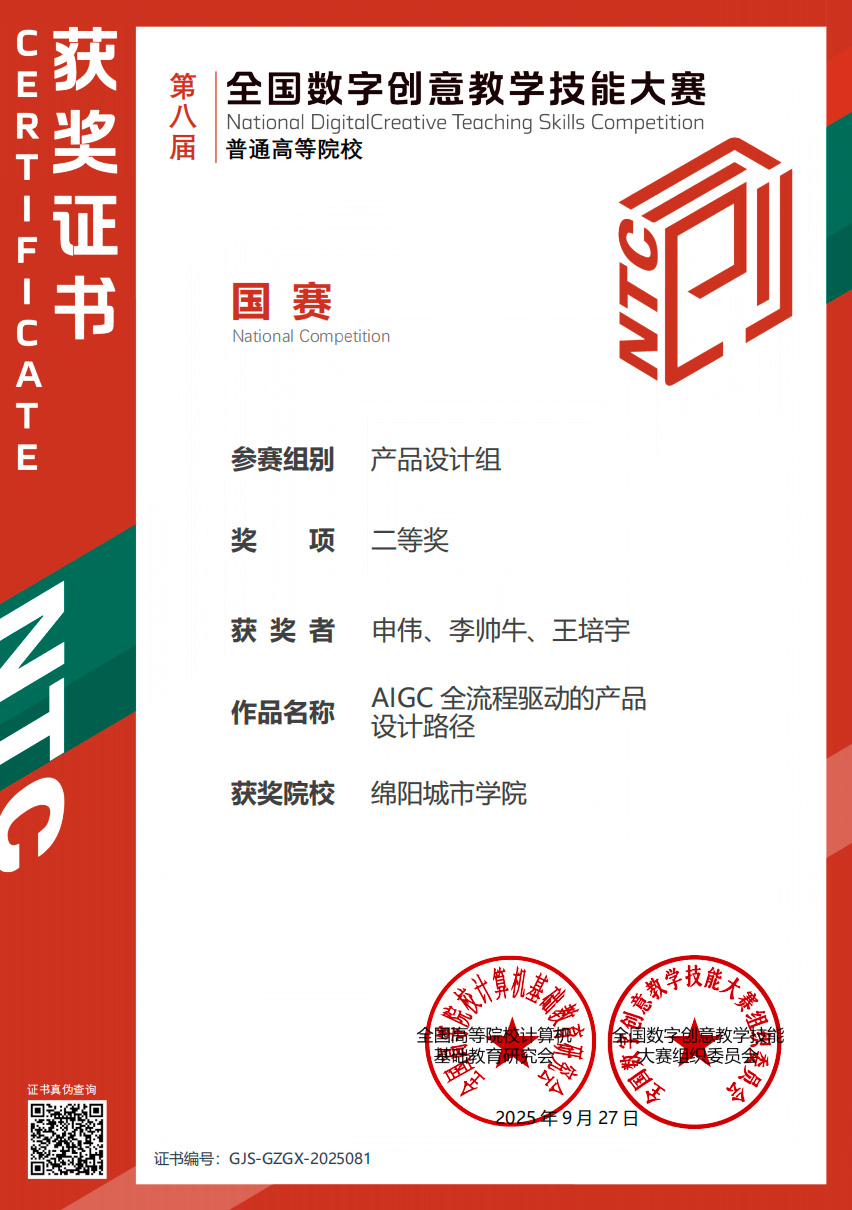本次大赛共收到来自全国574所高校的4581件作品,有效参赛作品达3601件,参赛教师逾5620人,赛事规模与竞争激烈程度均创历届新高。经专家严格评审,最终仅695件作品入围全国总决赛,覆盖304所高校。我院申伟老师主讲的《AIGC全流程驱动的产品设计路径》与李明浩老师主讲的《人机工程学-人机操纵装置设计》双双荣获全国二等奖;谢小林老师主讲的《数智赋能景观小品创新设计》和吕秋月老师主讲的《传统纹样在商业插画中的创新应用》则在省赛阶段脱颖而出,分别获得省级二等奖。