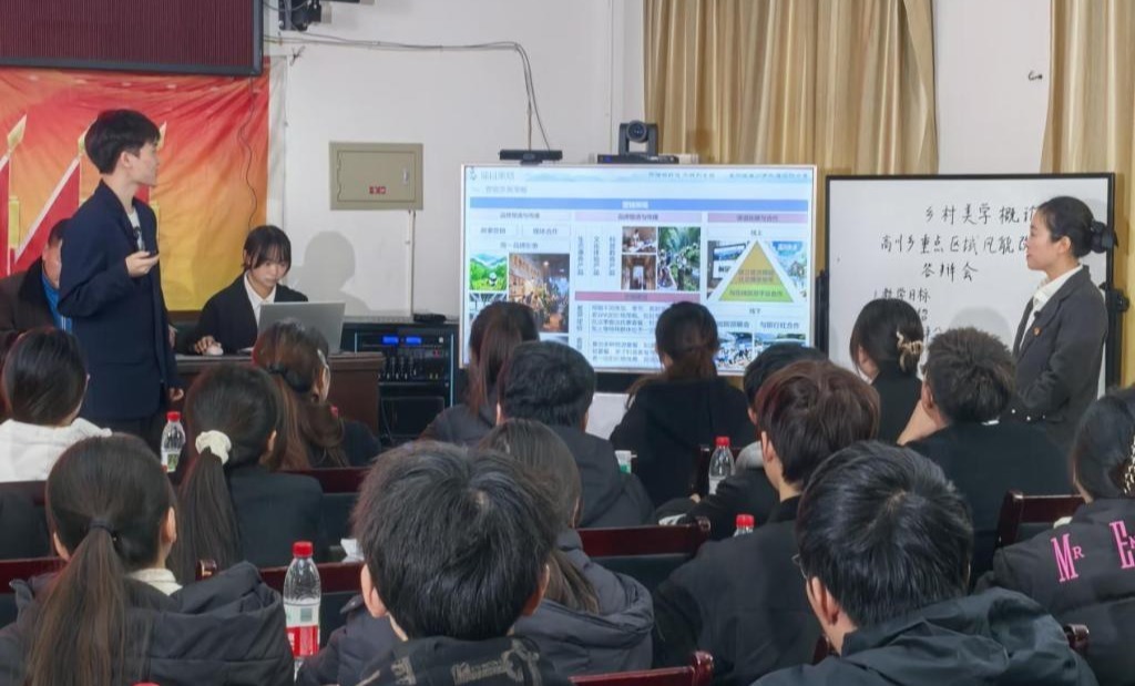 答辩会上,两组学生依次汇报《高川村重点区域风貌提升设计方案》,围绕村庄入口广场、废弃电影院等节点,从设计理念、文化融合、平面布置等方面展开详细阐述。由学院专业教师、高川乡领导、行业专家及村民代表组成的评审团,现场对方案的理论深度、创新性和本土契合度进行质询与点评,气氛热烈,思维碰撞不断。