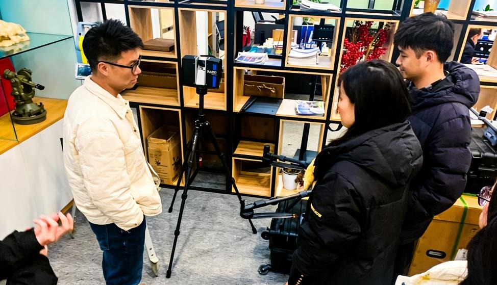 随后,师生一行参观了企业产品展示中心。技术人员现场演示三维激光扫描仪、GNSS测量系统、无人机低空摄影测量设备等先进仪器的操作流程,并介绍“智测云”“超隧云”自研软件的核心功能,让学生直观感受测绘新技术在隧道检测、智慧工地等场景中的应用魅力。
