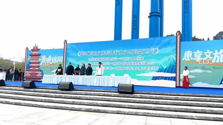 12月30日,“青睐绵阳·惠享文旅”第三届绵阳文化旅游消费季暨2026年游仙区“庆元旦·迎新年”全民消费系列活动开幕式在中华科学家公园举行。我院智能建造与设计专业集群副主任陈佳、艺术设计学专业副主任吕秋月及教师蒲灵梅代表专业出席活动,并与地方文旅企业现场签约文创联盟合作协议。
